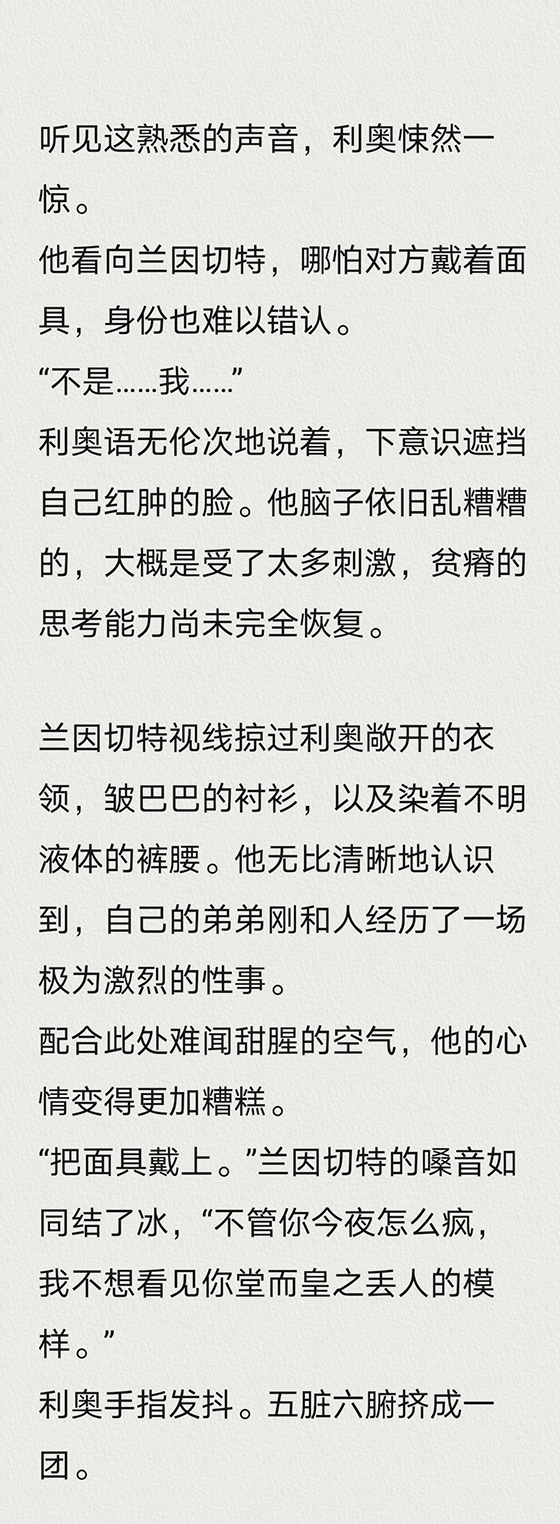 旁边客房里的男女大概已经结束了交媾,再没传出什幺动静。兰因切特捏着纸质文档,快速下楼离开,不想在这里多呆一分一秒。被抛下的利奥迈着僵硬的双腿,回房找到自己的眼罩面具,去楼下寻找女伴伊芙。