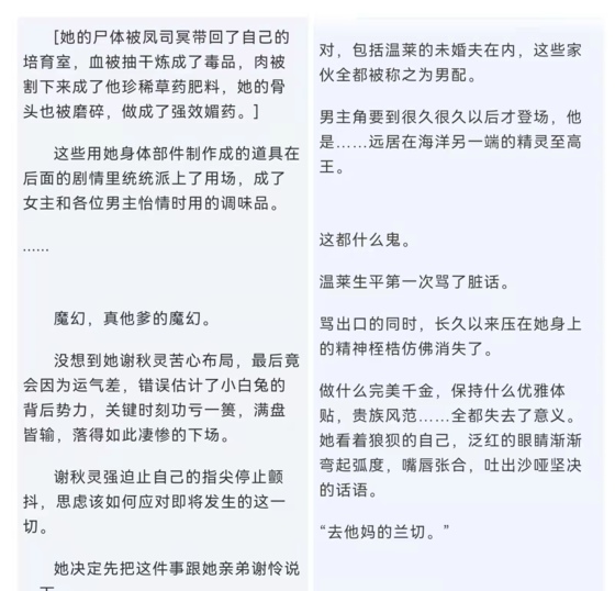 觉醒过程及开头行文:被强奸—大脑接收书籍剧情文本—得知自己的家族会覆灭,自己绝望自杀,而未婚夫和强奸犯都是原女主的男人—沐浴身体对镜子说“去他妈的兰切”。